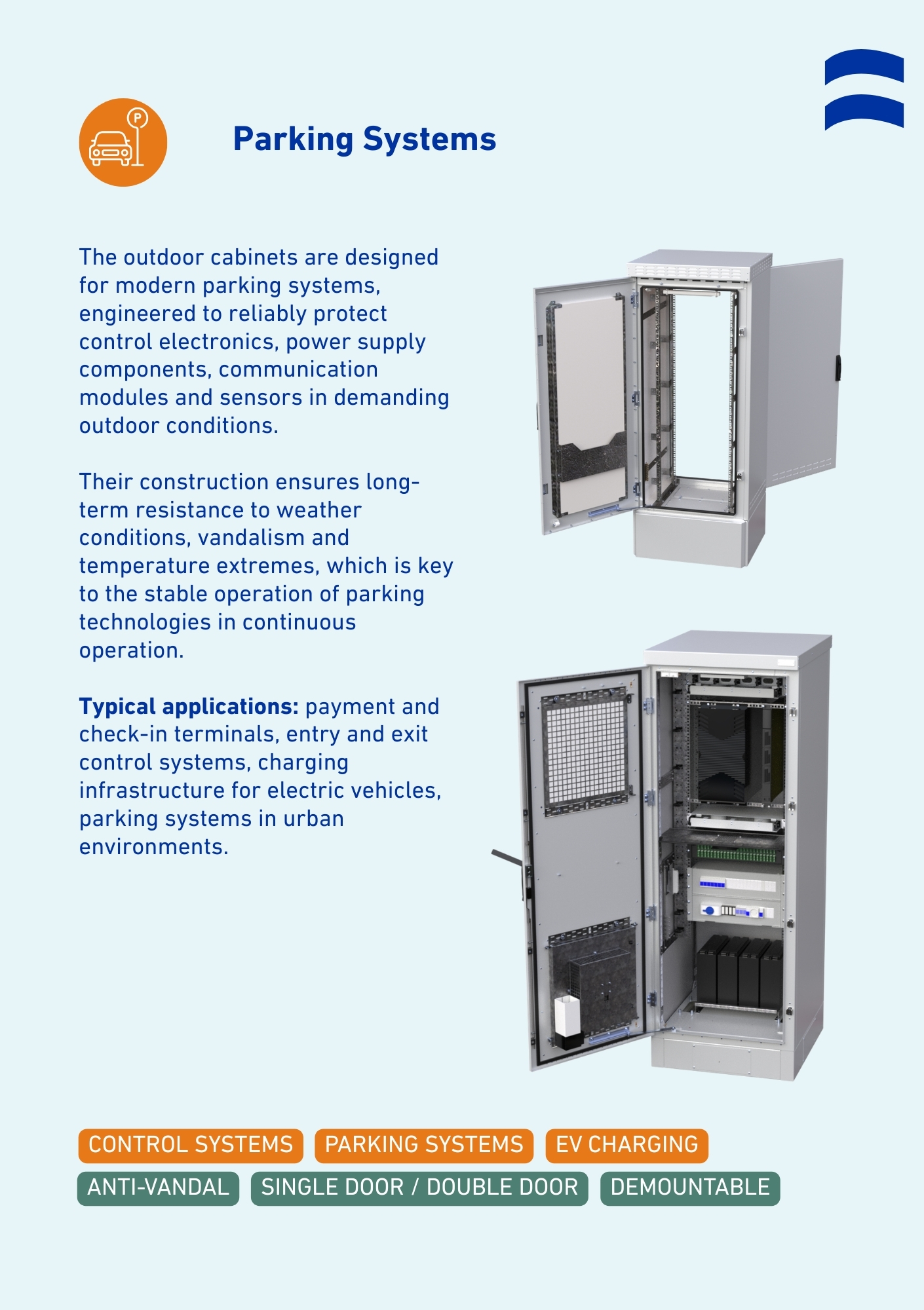 Parking Systems: Cabinets for parking and payment systems, providing reliable protection for control electronics, sensors, payment terminals and communication elements.