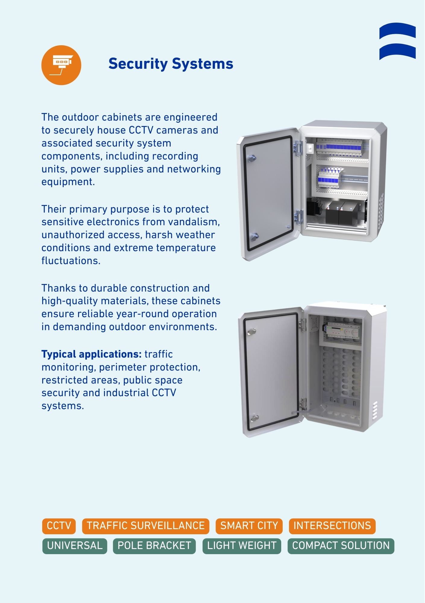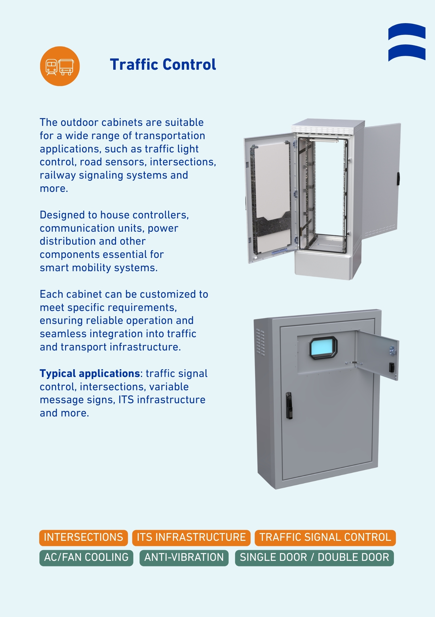 We provide high‑quality outdoor cabinets designed to protect and support key technologies across transportation, industrial and smart‑infrastructure sectors. Our cabinets ensure reliable operation in demanding outdoor environments and offer long‑term protection for traffic control, sensing, parking and security systems.