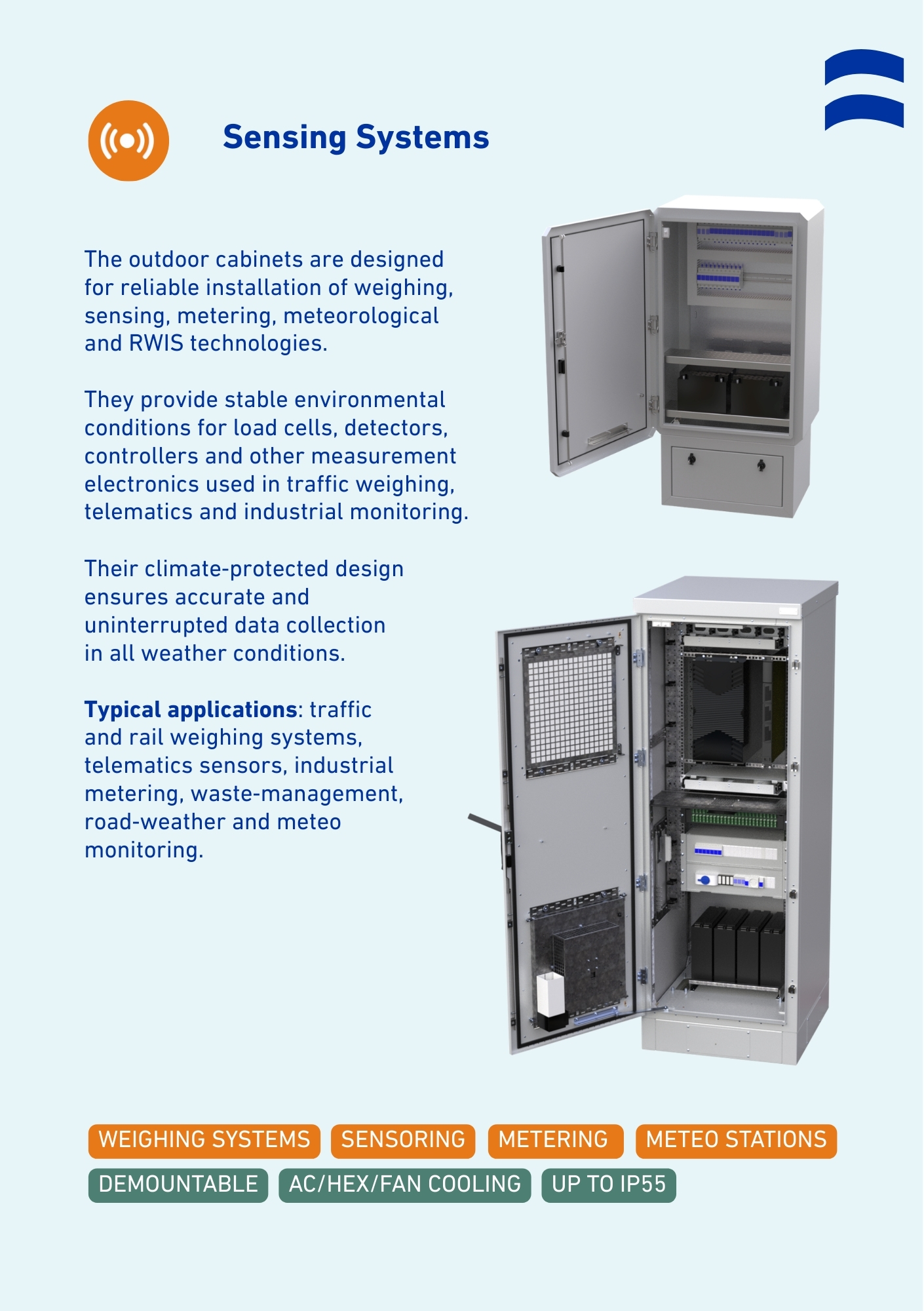 Sensing Systems: Cabinets for weighing, sensing and metering technologies used in traffic, rail, logistics and industrial measurement, and cabinets for meteorological and RWIS equipment.